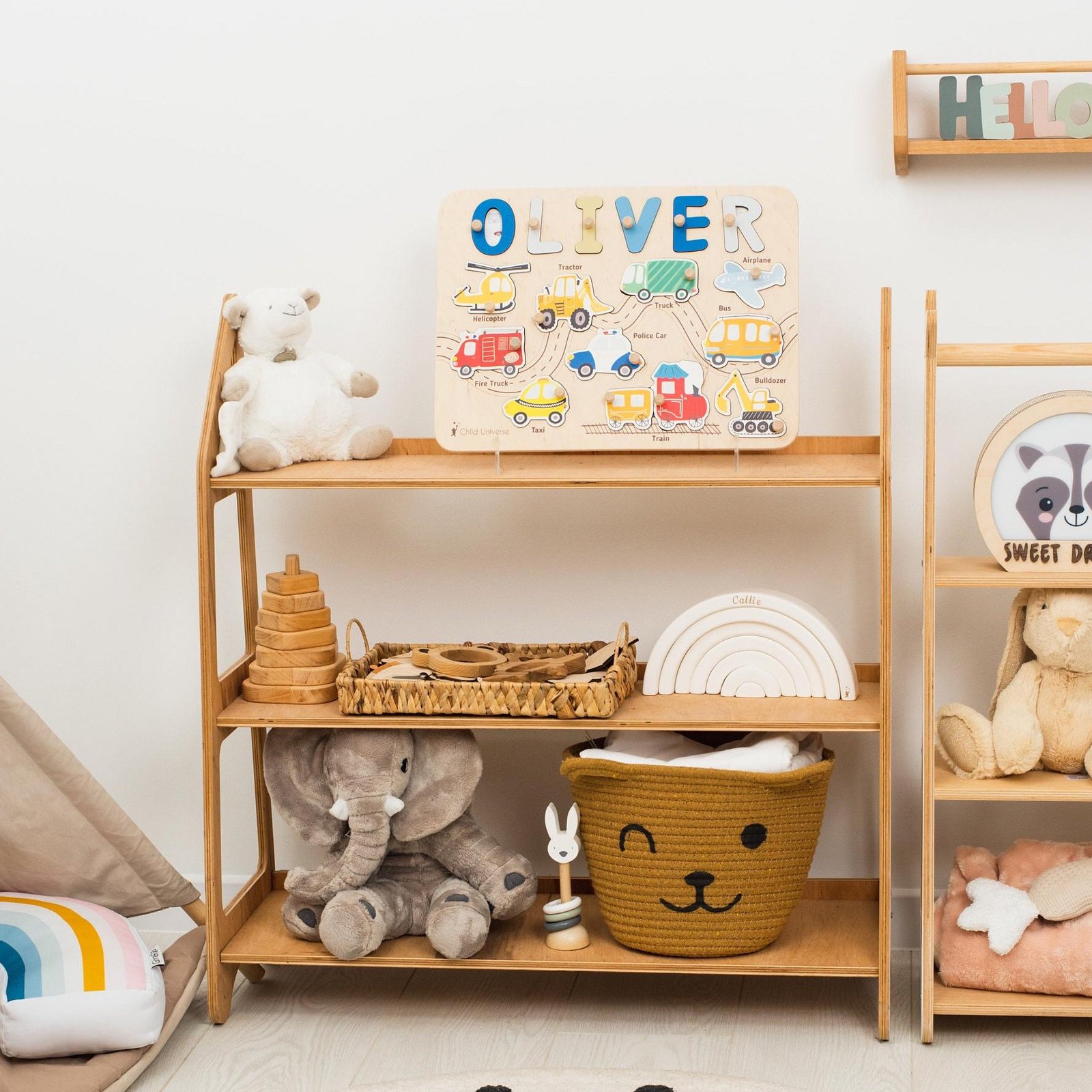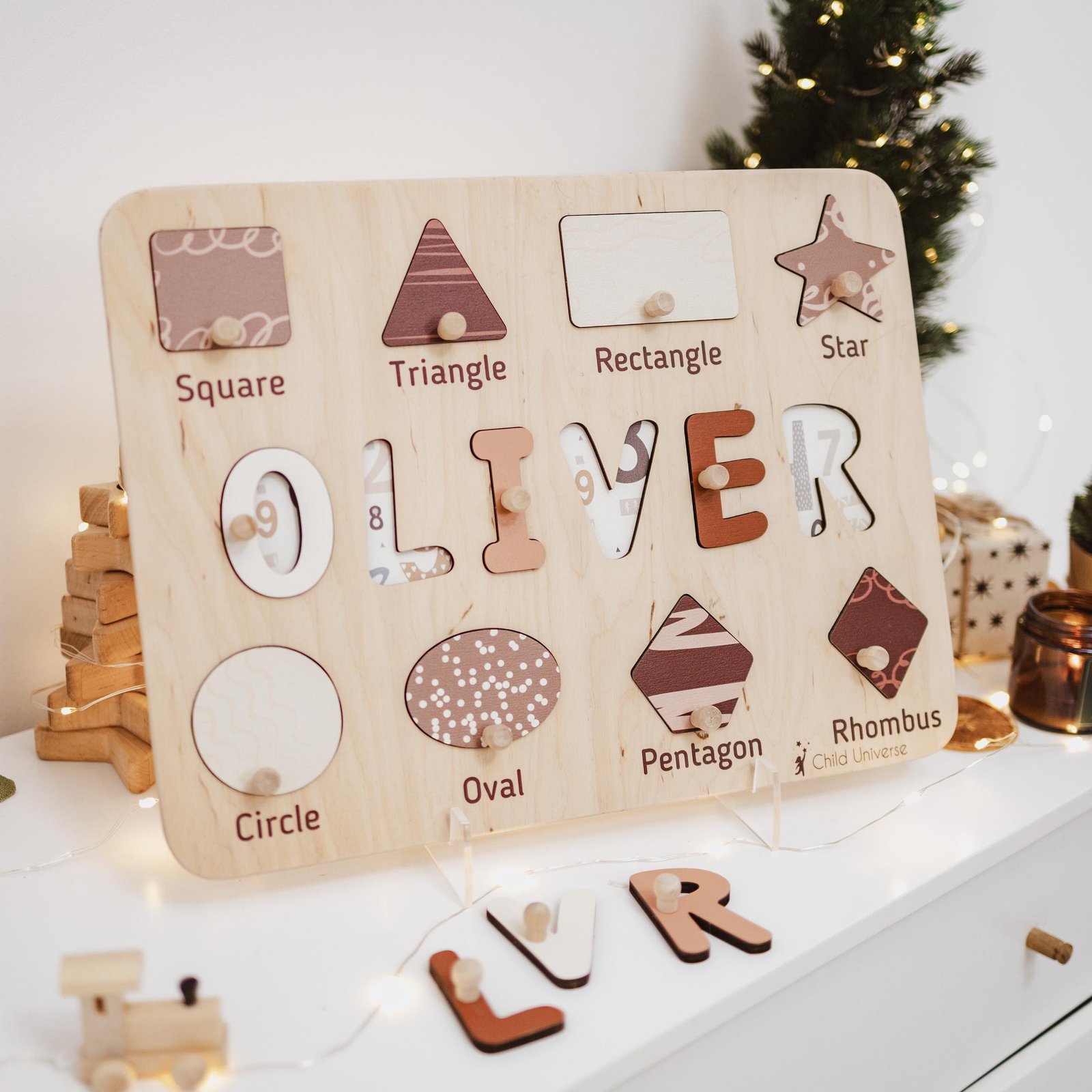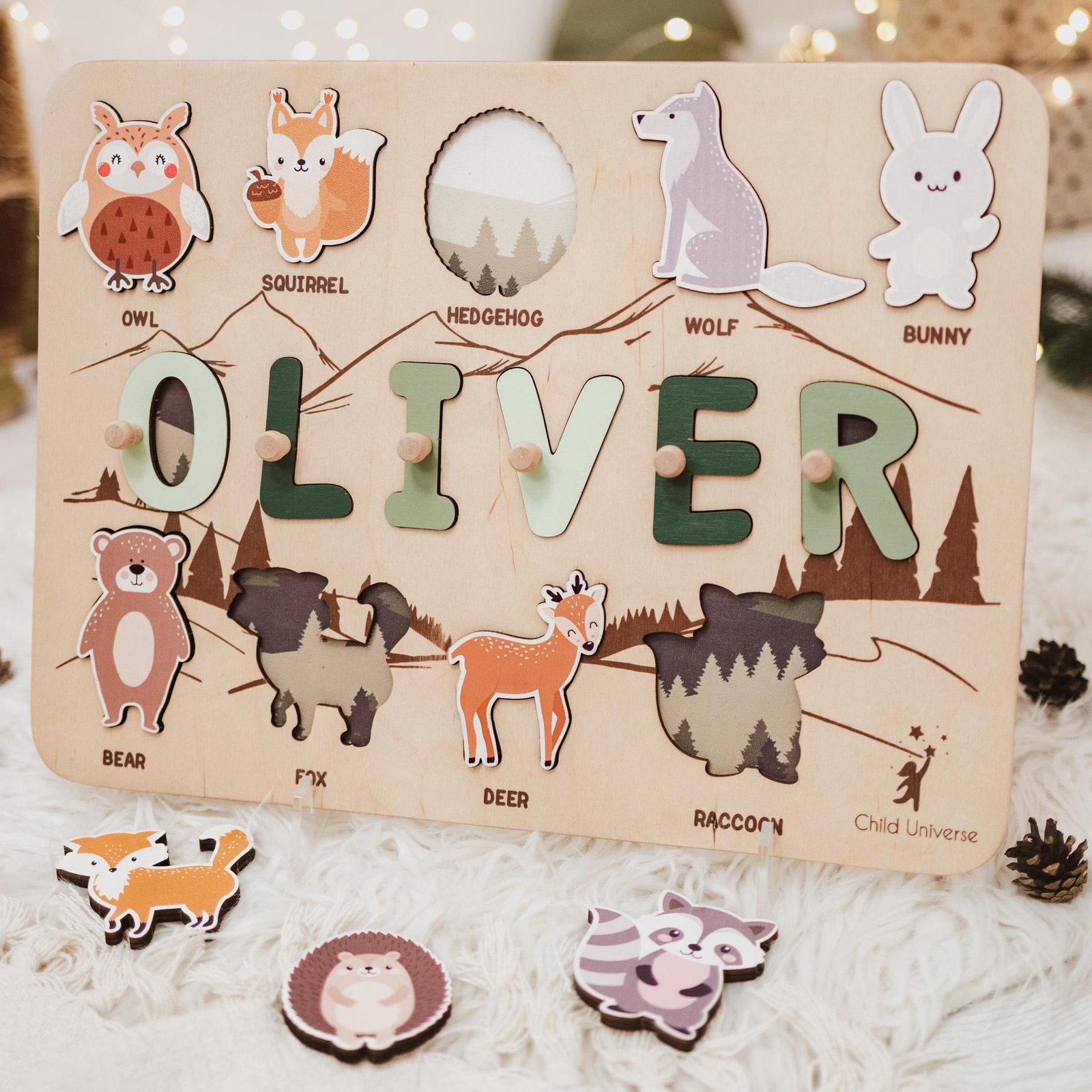 The Montessori busy board for toddlers improves their hand-eye coordination, fine motor skills, and spatial awareness. You’re welcome to make the name board a personal educational tool for your toddler — their name on it will cater to their curiosity and encourage imaginative play. A personalized wooden name puzzle will become a timeless memory for its little owner and happy parents. Our product will also become a beautiful piece of decor once the child steps into the next stage of development.