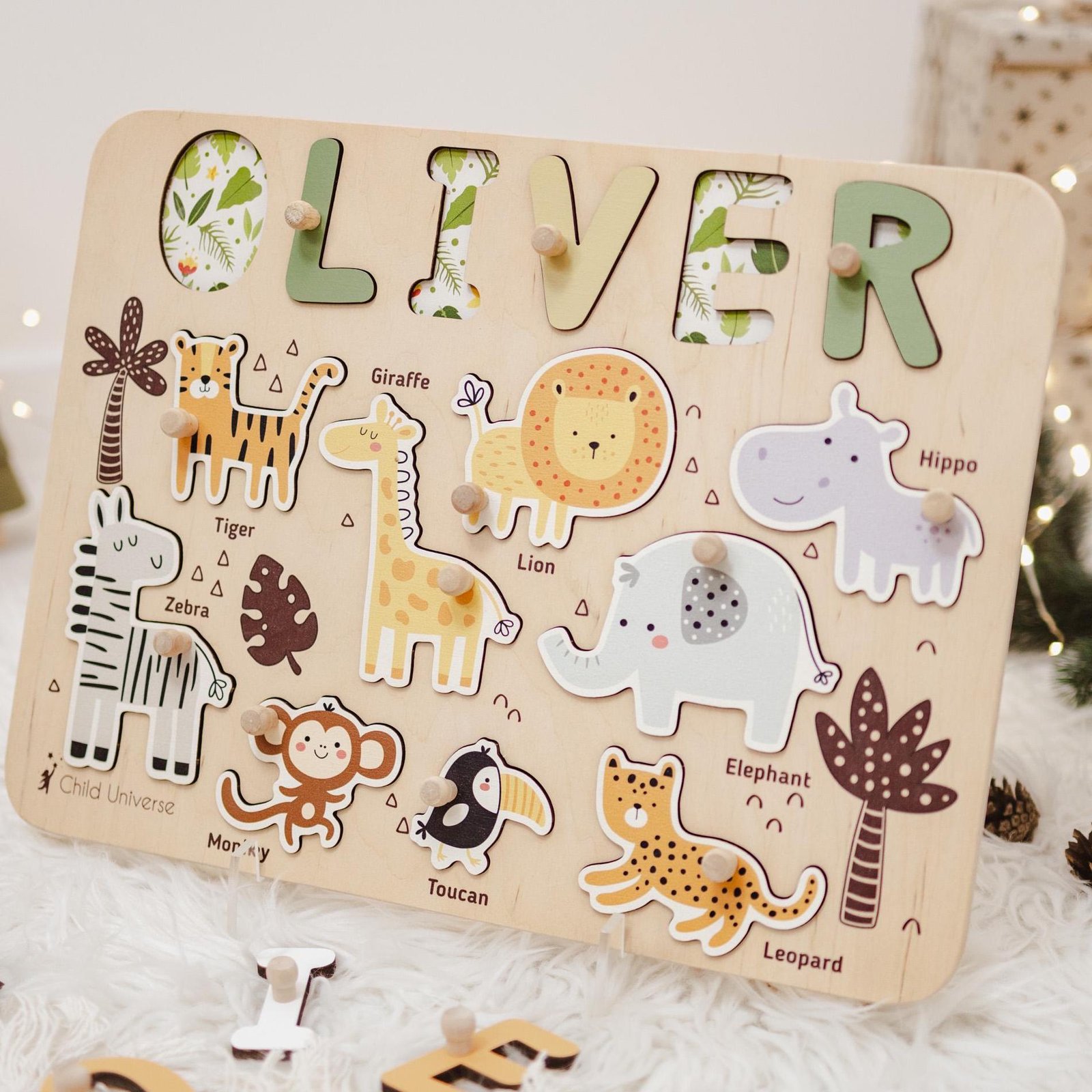 Crafted from 100% high-quality wood and finished with love, the Jungle Puzzle Board for Kids is both a thoughtful gift and a functional educational tool. Designed with cute jungle-themed figures and your child’s name, this personalized board transforms learning into a playful experience—improving hand-eye coordination, spatial awareness, and fine motor development, while also being a delightful piece of nursery décor.